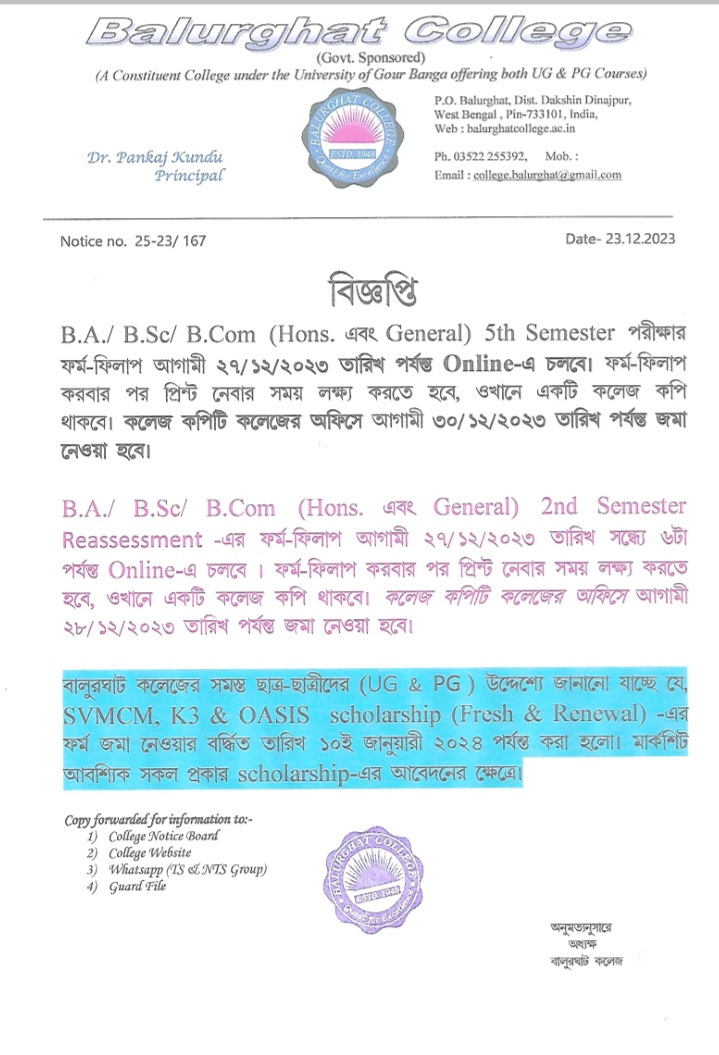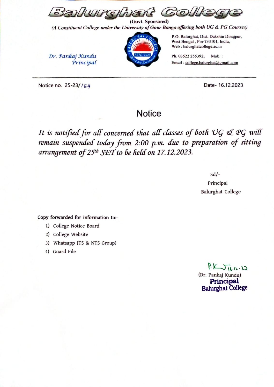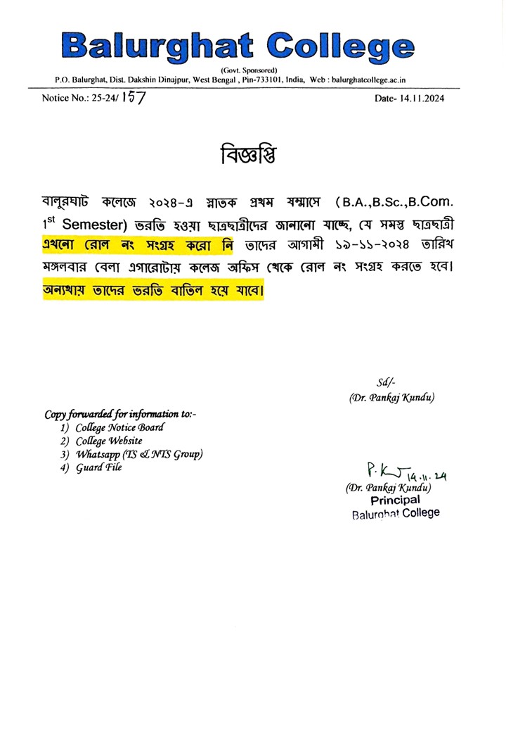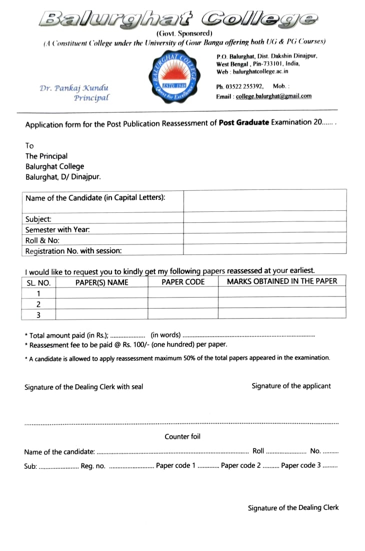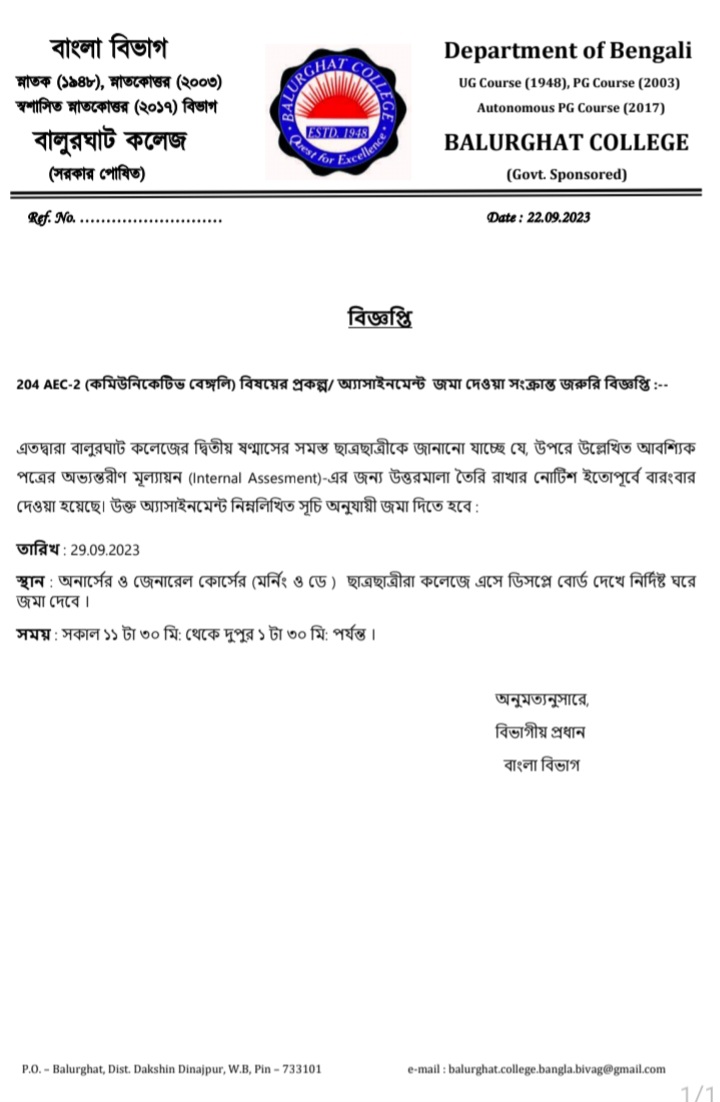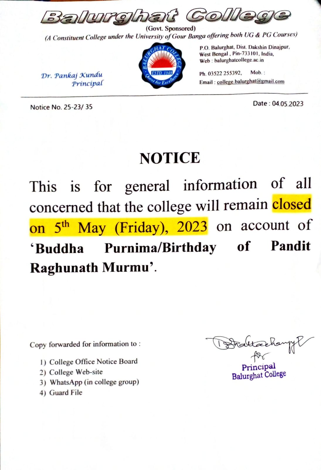 Balurghat College, established in 1948, is a provider of Bachelor and P.G. level education. The college is fully responsive to the local needs and ensure its contribution not only college level education but to the social and economic development of the region also. The college has established itself over the years as one of the leading colleges of the university. At present there are 16 undergraduates Honours programs, 3 Post graduates programs. More over 20 general subjects are offered to the students for opting any 3 subjects for pursuing degree program in general course in all 3 important streams: Arts, Science and Commerce. During the current session 2019-20 there are approximately 5500 students enrolled in different programs.