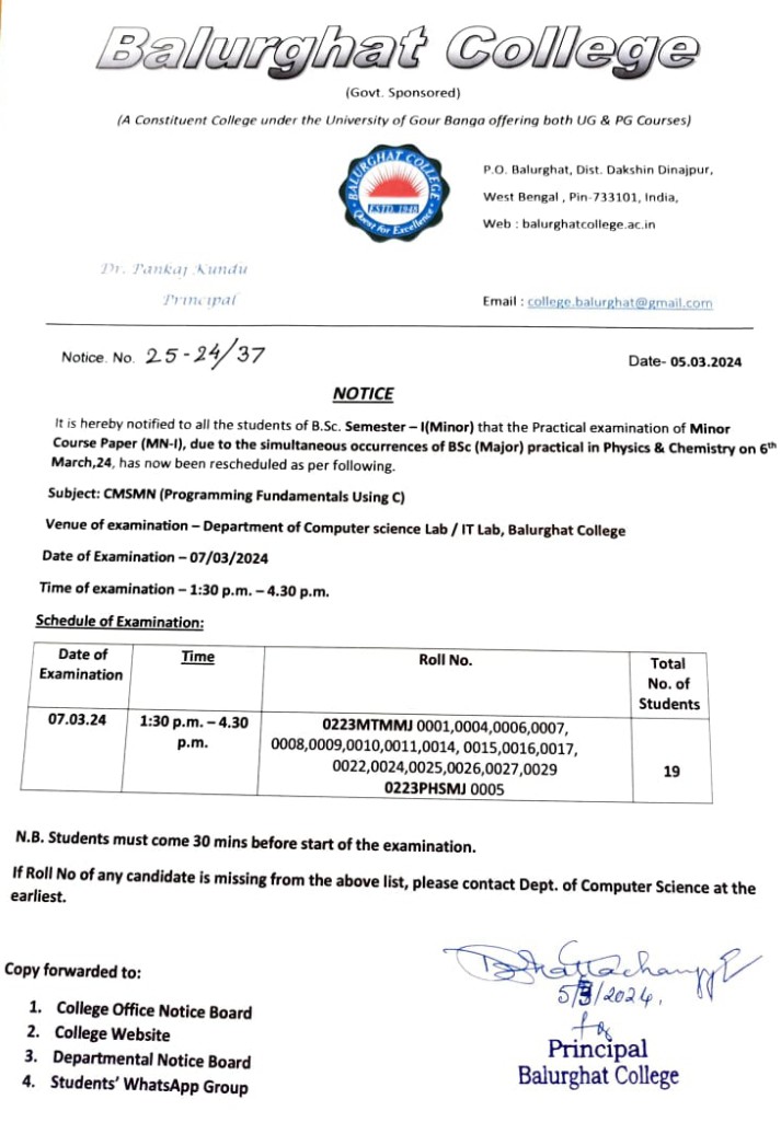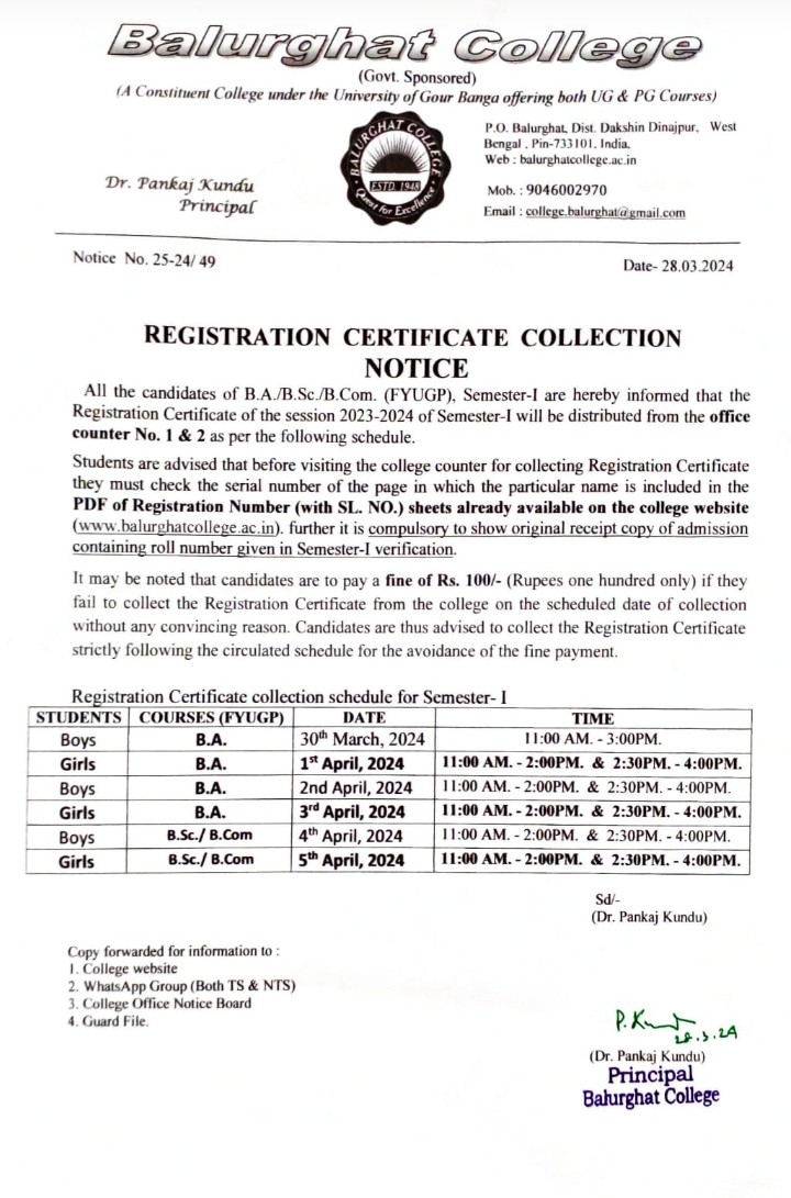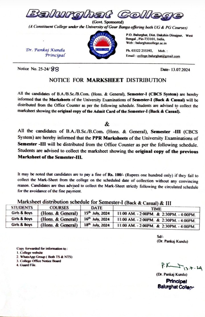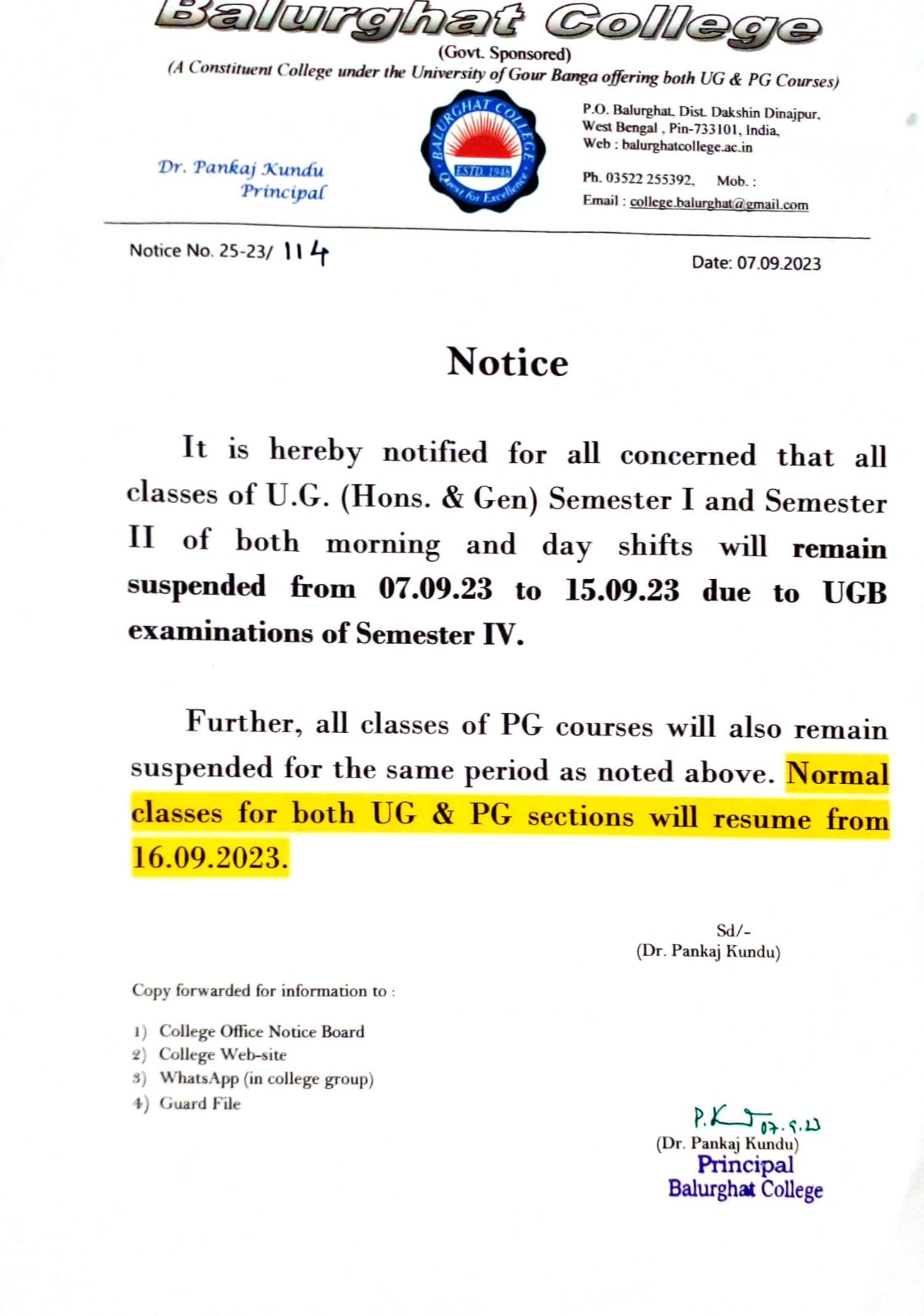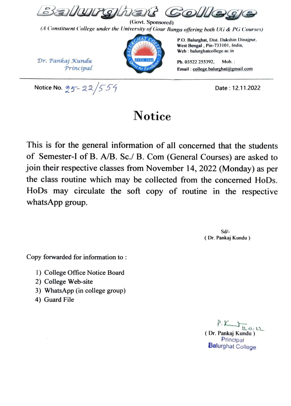 Balurghat College, established in 1948, is a provider of Bachelor and P.G. level education. The college is fully responsive to the local needs and ensure its contribution not only college level education but to the social and economic development of the region also. The college has established itself over the years as one of the leading colleges of the university. At present there are 16 undergraduates Honours programs, 3 Post graduates programs. More over 20 general subjects are offered to the students for opting any 3 subjects for pursuing degree program in general course in all 3 important streams: Arts, Science and Commerce. During the current session 2019-20 there are approximately 5500 students enrolled in different programs.